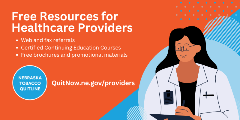 Providers can refer patients using the online web referral option or the updated fax referral form. Visit QuitNow.ne.gov/providers to access tools, resources, and education modules, plus the web and fax referrals for providers ready to help patients quit.